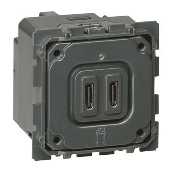 Встраиваемое зарядное устройство серии Céliane с двумя разъемами USB типа C для питания и зарядки мобильных устройств без внешнего адаптера. Применяется в жилых, гостиничных и офисных интерьерах, где требуется современная точка зарядки в стандартной электроустановке. Подходит для смартфонов, наушников и другой портативной электроники.