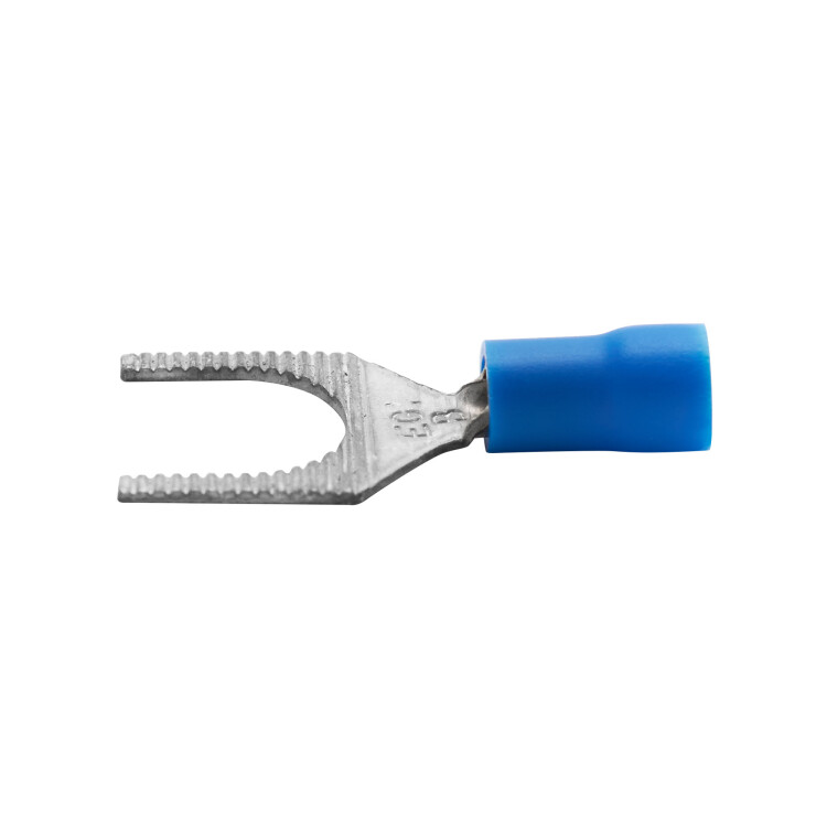 Наконечники соединяются методом «вилка-розетка» («папа-мама»). Материал контактной части – медь. Наконечник имеет форму вилки. Луженое покрытие обеспечивает защиту от коррозии. Фланец изолирован. Цвет изоляции - синий. Номинальное поперечное сечение - 1,5-2,5 мм2.