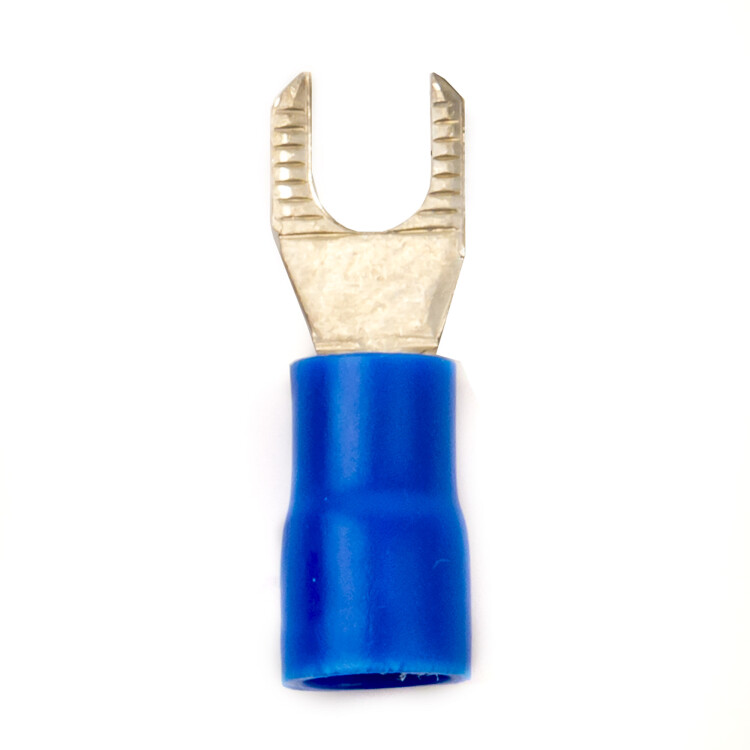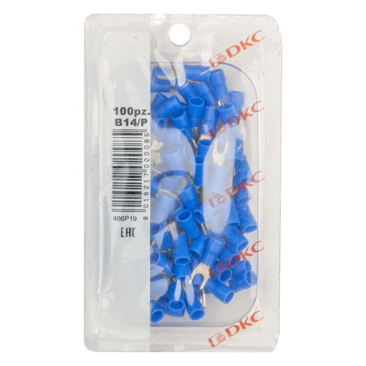 Наконечники соединяются методом «вилка-розетка» («папа-мама»). Материал контактной части – медь. Наконечник имеет форму вилки. Луженое покрытие обеспечивает защиту от коррозии. Фланец изолирован. Цвет изоляции - синий. Номинальное поперечное сечение - 1,5-2,5 мм2. В упаковке 100 штук.