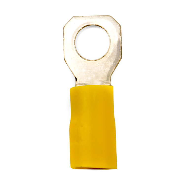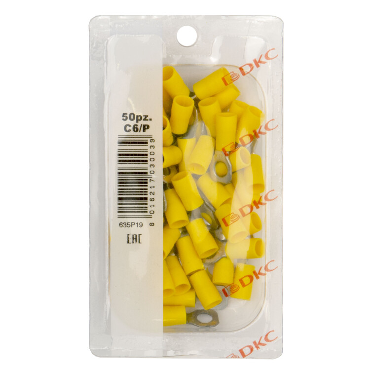 Изолированный кабельный наконечник с отверстием под винт (НКИ) предназначен для оконцевания кабелей в цепях переменного и постоянного тока с рабочим напряжением до 600 В. Особенностями наконечника являются квадратная форма контактной лопатки, обеспечивающая надёжную фиксацию на клеммах с боковыми ограничителями, а также внутренняя поверхностью гильзы с зазубринами, увеличивающая плотность контакта при обжиме. Луженое покрытие обеспечивает защиту от коррозии. Наконечник соответствует классу горючести V0 по стандарту UL 94. Диапазон сечений — 2,5-6 мм², диаметр крепёжного элемента — М6. Цвет — желтый.