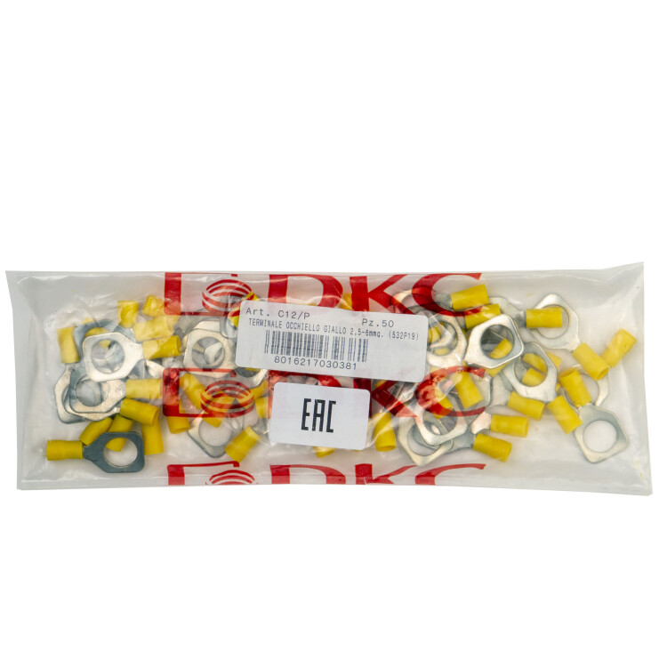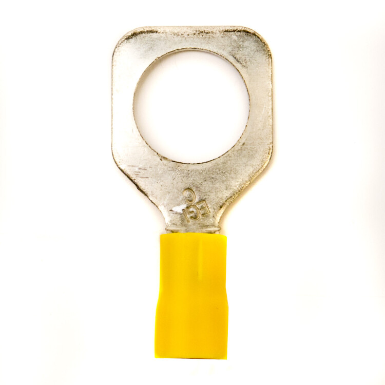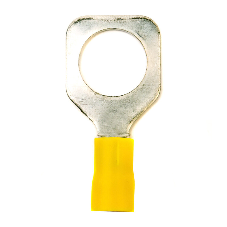 Изолированный кабельный наконечник с отверстием под винт (НКИ) предназначен для оконцевания кабелей в цепях переменного и постоянного тока с рабочим напряжением до 600 В. Особенностями наконечника являются квадратная форма контактной лопатки, обеспечивающая надёжную фиксацию на клеммах с боковыми ограничителями, а также внутренняя поверхностью гильзы с зазубринами, увеличивающая плотность контакта при обжиме. Луженое покрытие обеспечивает защиту от коррозии. Наконечник соответствует классу горючести V0 по стандарту UL 94. Диапазон сечений — 2,5-6 мм², диаметр крепёжного элемента — М12. Цвет — желтый.