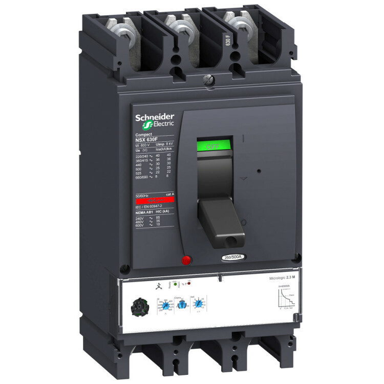 Автоматический выключатель Compact NSX630F Schneider Electric, 3P3d - номинальный ток 500 А - Icu = 36 кА 380/415 В - Ics=100% Icu - с электронным расцепителем Micrologic 2.3-M (защита электродвигателей LSOI) - ШхВхГ - 160x290x150 мм - исполнение - стационарный - монтаж - на DIN-рейке или плате. Преимущества: Прямой доступ к экономии затрат, безопасность и защита, контроль и измерение параметров электроэнергии, надежность энергоснабжения, простота и удобство. Применения: Применение в системах электроснабжения объектов любого масштаба – от крупнейших промышленных предприятий до офисных зданий для защиты распределительных сетей, генераторов, кабелей большой протяженности, электродвигателей.