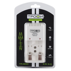 Универсальное зарядное устройство для 1 или 2 аккумуляторов типоразмеров АА, ААА, C, D или 1 на 9V (крона). Ток заряда 200мА (25мА для кроны), два индивидуальных канала, время заряда для аккумуляторов АА 2500мАч - 16,5 часов, ААА 950мАч - 6,5 часов. Пожаробезопасный пластик. Защита от неправильной установки. LED-индикатор подключения.