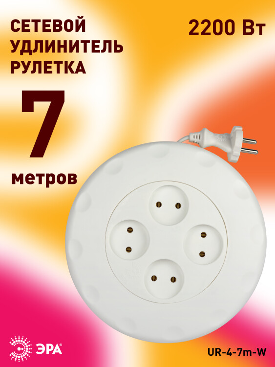 Удлинитель электрический рулетка Эра UR-4-7m-W без заземления, ШВВП, 2x1мм2, 4 розетки, 7 м. Рассчитан на максимальную мощность 10А/2200 Вт. Удлинитель Эра станет Вашим надежным помощником, если Ваши любимые электроприборы находятся далеко от розеток. Провод в удлинителях Эра сделан из 100% меди, что делает его абсолютно пожаробезопасным. Корпус выполнен из ударопрочного и негорючего пластика (полипропилен). В моделях с заземлением у вилки есть кольцо для удобного извлечения из розетки. Подходит для подключения приборов средней мощности: TV, компьютерная периферия, осветительные приборы. Дизайн удлинителя разработан в России командой Эра Slyle. Дизайн удлинителя разработан в России командой Эра Style.