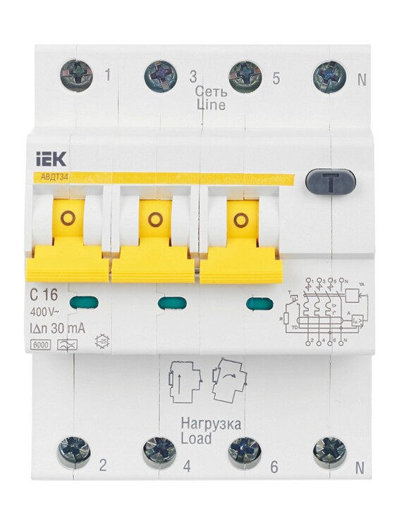 АВДТ34 выпускаются в четырехполюсном исполнении на номинальные токи 6, 10, 16, 20, 25, 32, 40, 50, 63 А и номинальные отключающие дифференциальные токи 10, 30, 100, 300 мА.