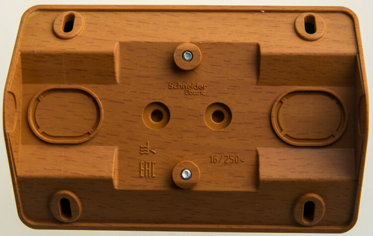Розетка Systeme Electric (ранее Schneider Electric) ЭТЮД (бук, открытой установки) двухместная угловая, без шторок и заземления предназначена для применения в сетях до 250В, на ток до 16А. Двухместная розетка позволяет подключить два устройства в одном месте. Ее конструкция позволяет установить розетку в угол помещения. Изделия цвета Бук обладают уникальным рисунком, напоминающим древесный сруб. Сделано в России.