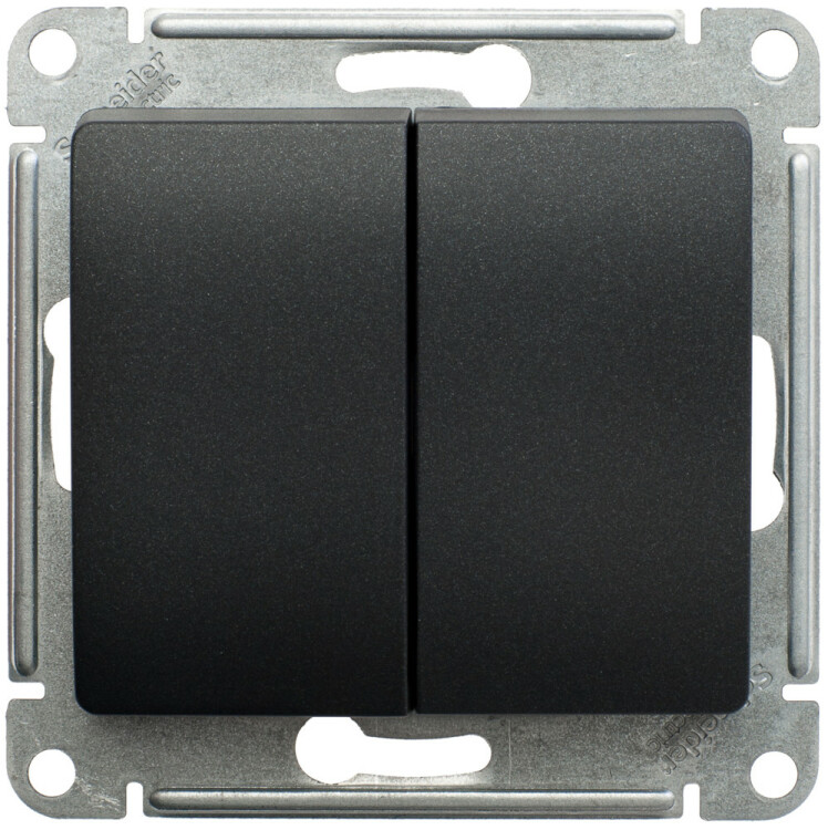 Механизм Systeme Electric (ранее Schneider Electric) серии Glossa (цвет антрацит) переключателя 2-клавишного подходит для сетей 250 В, на ток 10 А. Переключатель позволяет управлять одним источником света с двух точек. Выполнен из материала PС+ASA, стойкого к УФ-излучению и появлению царапин. Эргономичные клеммы расположены в два ряда: сверху и снизу.