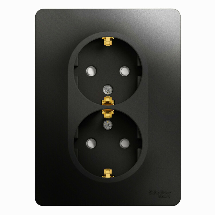 Розетка двойная Systeme Electric (ранее Schneider Electric) серии Glossa (в сборе, цвет антрацит) с заземлением и шторками подходит для сетей 250 В, на ток 16 А. Заземляющий контакт обеспечивает дополнительную защиту от удара электрическим током. При наличии заземления электрический потенциал уходит в землю, защищая человека. Выполнен из материала PС+ASA, стойкого к УФ-излучению и появлению царапин. Двойная розетка позволяет подключить два устройства в одном месте. (ранее Schneider Electric ЭУИ UNICA NEW NU206754)