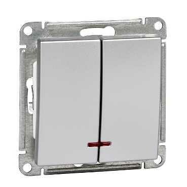 Механизм Systeme Electric (ранее Schneider Electric) W59 (цвет матовый хром) выключателя 2-клавишного с подсветкой подходит для сетей 250 В, на ток до 10 А.