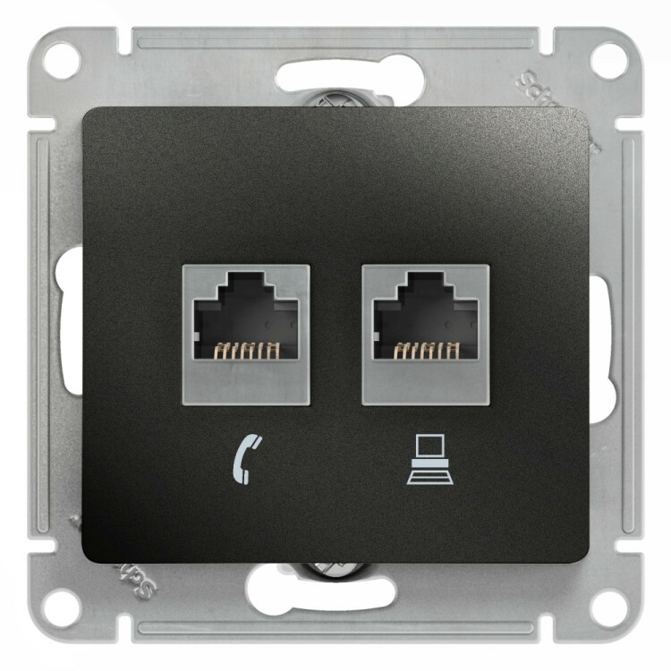 Механизм Systeme Electric (ранее Schneider Electric) серии Glossa (цвет антрацит) двойной розетки разъёмами RJ45 категория 5е и RJ11 предназначен для удобного и быстрого подключения вашего компьютера и телефона к соответствующим сетям. Выполнен из материала PС+ASA, стойкого к УФ-излучению и появлению царапин.