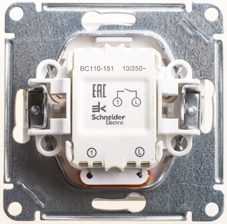 Механизм Schneider Electric W59 (цвет шампань) выключателя 1-клавишного с подсветкой и самовозвратом подходит для сетей 250 В, на ток до 10 А.