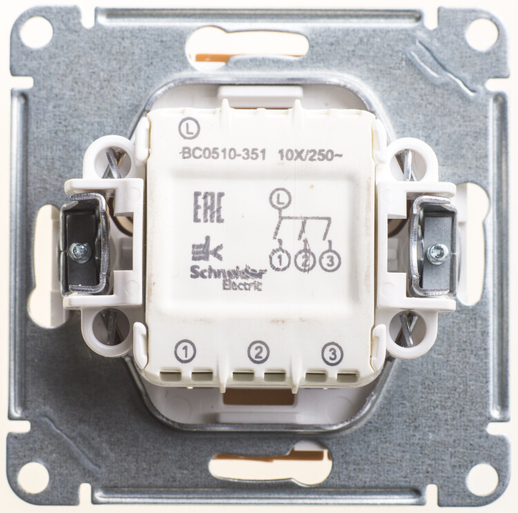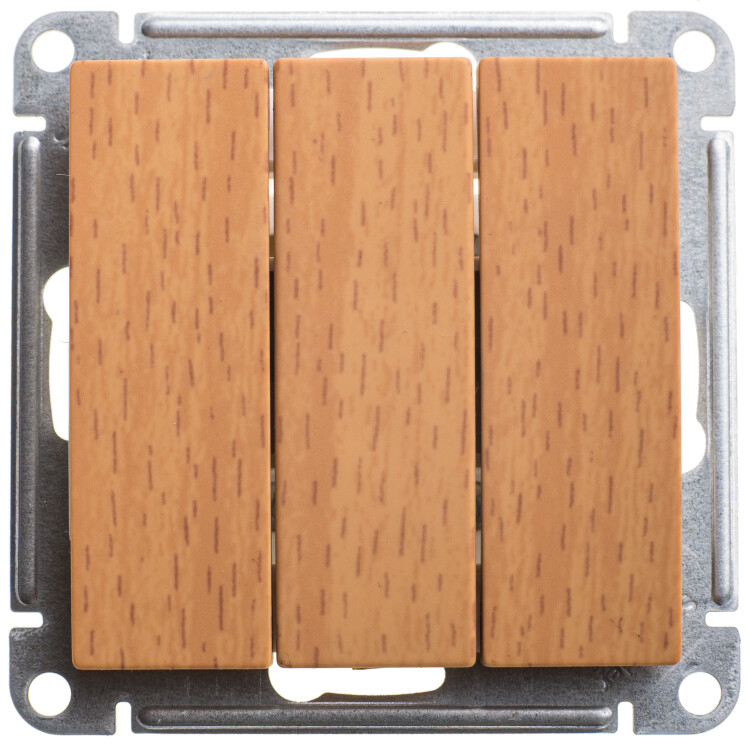 Механизм Schneider Electric W59 (цвет бук) выключателя 3-клавишного подходит для сетей 250 В, на ток до 10 А.