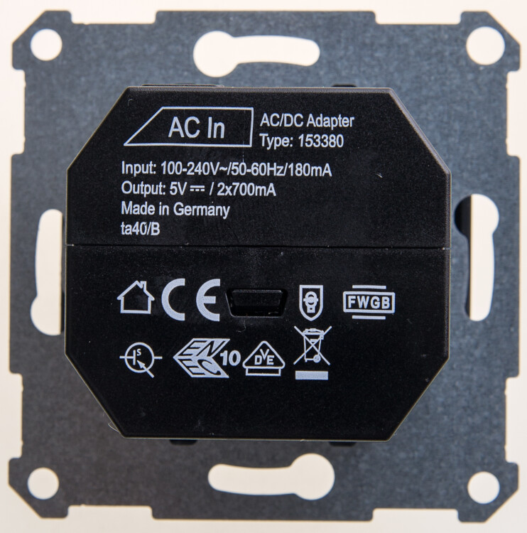 Механизм Schneider Electric Glossa (цвет антрацит) розетки для зарядки с двумя разъёмами USB с выходными напряжением 5 В постоянного тока и выходами с номинальным током по 1,4 А.