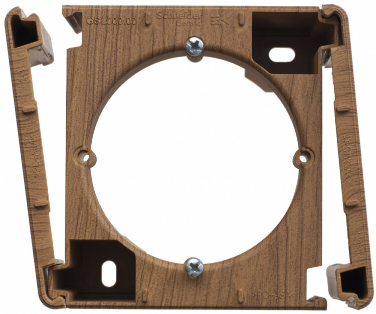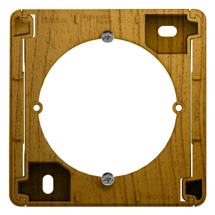 Коробка Systeme Electric (ранее Schneider Electric) серии Glossa (цвет дерево дуб) наружного монтажа. Позволяет установить любую функцию скрытого монтажа на стену (как изделие открытого монтажа). Выполнена из материала PС+ASA, стойкого к УФ-излучению и появлению царапин.