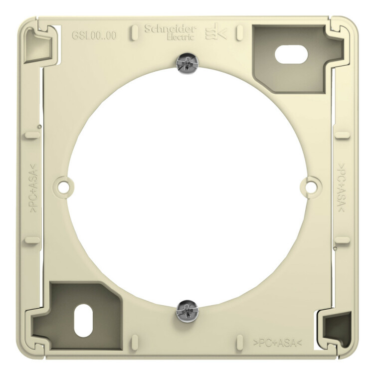 Коробка Systeme Electric (ранее Schneider Electric) серии Glossa (цвет бежевый) наружного монтажа. Позволяет установить любую функцию скрытого монтажа на стену (как изделие открытого монтажа). Выполнена из материала PС+ASA, стойкого к УФ-излучению и появлению царапин.
