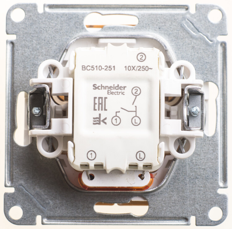 Механизм Schneider Electric W59 (цвет бук) выключателя 2-клавишного с подсветкой подходит для сетей 250 В, на ток до 10 А.