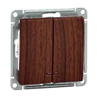 Механизм Schneider Electric W59 (цвет морёный дуб) выключателя 2-клавишного с подсветкой подходит для сетей 250 В, на ток до 10 А.