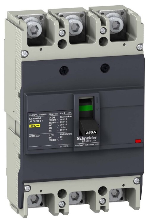Автоматический выключатель EasyPact EZC250N Schneider Electric; 3P3t; номинальный ток 100 А; Icu = 25 kA при 400/415 В; Ics=50% Icu; расцепитель and ndash; термомагнитный, нерегулируемый; ШхГхВ and ndash; 140х68x165 мм; исполнение and ndash; стационарный; монтаж - на панели.