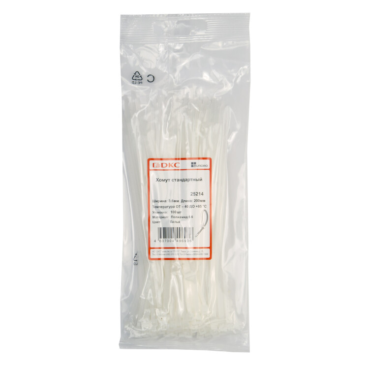 Хомуты (или, иначе, стяжки) это популярный крепежный элемент, применяющийся при монтажных или строительных работах. Хомуты ДКС прочны, устойчивы к коррозии и воздействию агрессивных сред, что позволяет использовать их не только внутри помещений, но и на улице. С помощью гибких хомутов можно создавать как жесткие, так и подвижные соединения. Ребристые внутренняя и внешняя стороны обеспечивают надежную фиксацию и предотвращает соскальзывание хомута. Изделие имеет длину 200 мм, ширину 3,6 мм, устойчивость к растяжению 180 H. Не рекомендуется использовать стяжки в зонах, где они будут подвергаться воздействию прямых солнечных лучей. Температура монтажа составляет от -30 С до +60 С, температура эксплуатации от -45 С до +85 С. Материал полиамид. Цвет белый.