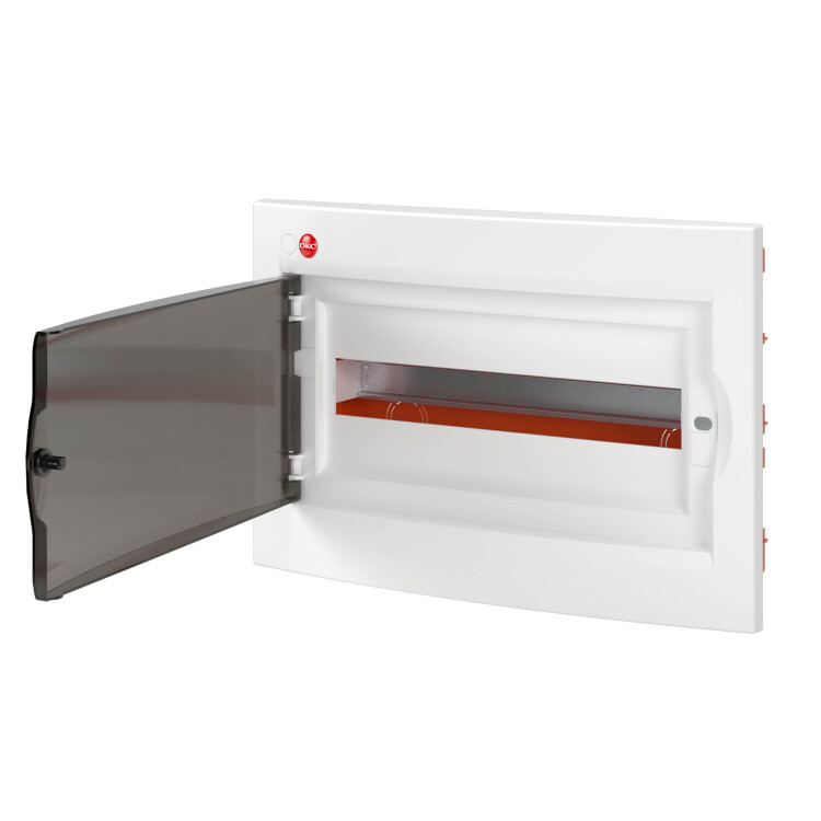 Встраиваемый распределительный щиток ДКС предназначен для монтажа в жилых и административных помещениях для установки автоматических выключателей любых производителей: таймеров, устройств защитного отключения и управления освещением и т.д. Щиток имеет оцинкованную DIN-рейку и суппорт, заглушки для пустых модулей, сборочные винты и заглушки для них, самоклеящуюся этикетку для маркировки цепей. Преперфорированные отверстия и насечки на задней стенке обеспечивают точное соединение с пластиковыми трубами и обеспечивают легкий монтаж. Клеммный блок 87518 в комплекте с крепежом, для коммутации питающих линий, жил проводов и кабелей. Дверца выполнена из затемненного полупрозрачного пластика. Специальная конструкция петель дает возможность открывать дверцу более чем на 180°. Замок для дверцы 87188, в комплекте с ключами. Степень пыле- и влагозащиты IP 41. Количество модулей - 18. Параметры щитка: ширина - 411 мм, высота - 300 мм, глубина встраиваемой части - 77 мм. Материал - термостойкий и ударопрочный пластик. Цвет - белый.