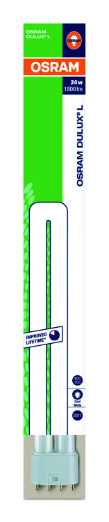 Компактная люминесцентная лампа неинтегрированная OSRAM DULUX L 24Вт с штырьковым одиночным четырехконтактным цоколем 2G11 и двухоборотной колбой.Лицензиатом торговой марки OSRAM в общем освещении является компания LEDVANCE.
