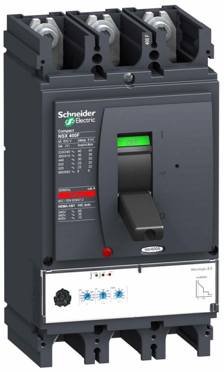 Автоматический выключатель Compact NSX400F Schneider Electric, 3P3d - номинальный ток 400 А - Icu = 36 кА 380/415 В - Ics=100% Icu - с электронным расцепителем Micrologic 2.3 (защита LSOI) - ШхВхГ - 140x225x110 мм - исполнение - стационарный - монтаж - на DIN-рейке или плате. Преимущества: Прямой доступ к экономии затрат, безопасность и защита, контроль и измерение параметров электроэнергии, надежность энергоснабжения, простота и удобство. Применения: Применение в системах электроснабжения объектов любого масштаба – от крупнейших промышленных предприятий до офисных зданий для защиты распределительных сетей, генераторов, кабелей большой протяженности, электродвигателей.