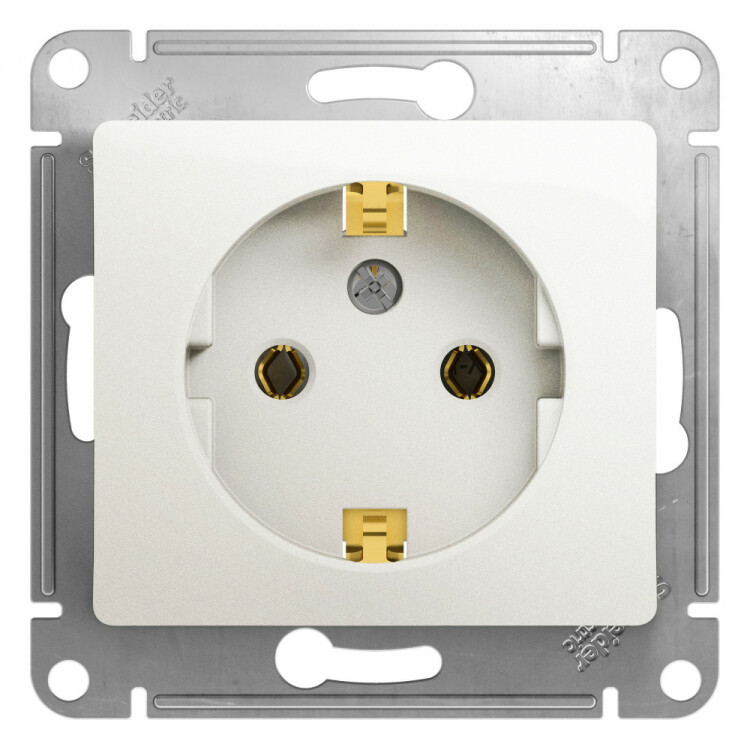Механизм Systeme Electric (ранее Schneider Electric) серии Glossa (цвет перламутр) розетки одинарной с заземлением и без шторок подходит для сетей 250 В, на ток 16 А. Заземляющий контакт обеспечивает дополнительную защиту от удара электрическим током. При наличии заземления электрический потенциал уходит в землю, защищая человека. Выполнен из материала PС+ASA, стойкого к УФ-излучению и появлению царапин. Эргономичные клеммы розеток расположены в один ряд.