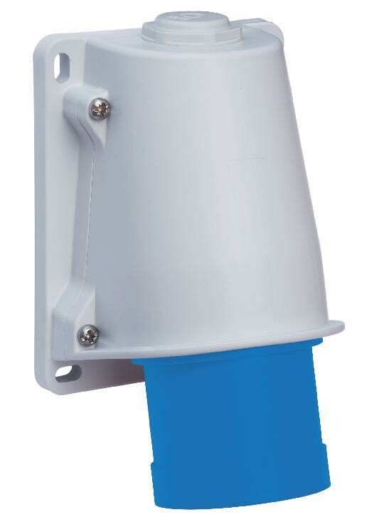 Вилка настенная PratiKa Schneider Electric на номинальный ток 16 А, напряжение 200-250 В, исполнением 2P+PEN, IP44, с быстрозажимными присоединениями кабелей сечением до 2,5 кв.мм.