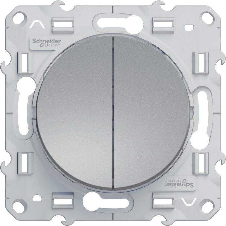 Выключатель двухклавишный Schneider Electric ODACE (цвет алюминий) с безвинтовыми зажимами предназначен для сетей до 250 В на ток до 10 А.