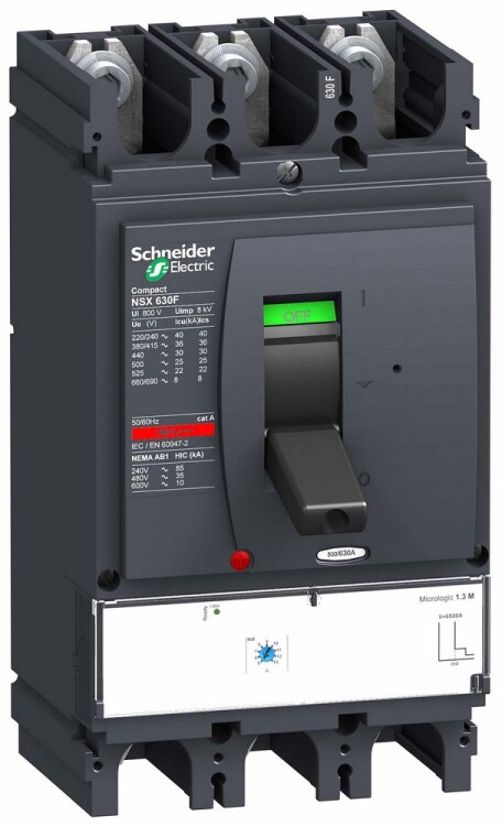 Автоматический выключатель Compact NSX630F Schneider Electric, 3P3d - номинальный ток 500 А - Icu = 36 кА 380/415 В - Ics=100% Icu - с электронным расцепителем Micrologic 1.3-M (защита электродвигателей I) - ШхВхГ - 160x290x150 мм - исполнение - стационарный - монтаж - на DIN-рейке или плате. Преимущества: Прямой доступ к экономии затрат, безопасность и защита, контроль и измерение параметров электроэнергии, надежность энергоснабжения, простота и удобство. Применения: Применение в системах электроснабжения объектов любого масштаба – от крупнейших промышленных предприятий до офисных зданий для защиты распределительных сетей, генераторов, кабелей большой протяженности, электродвигателей.