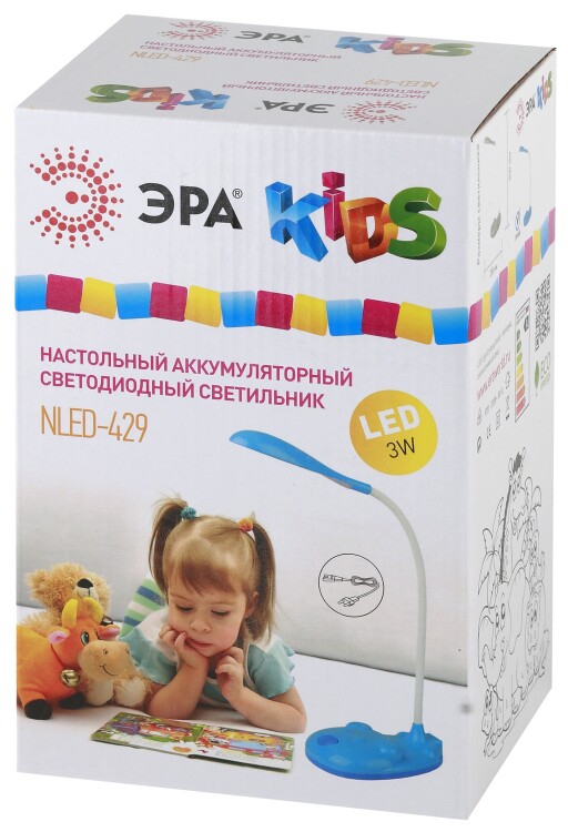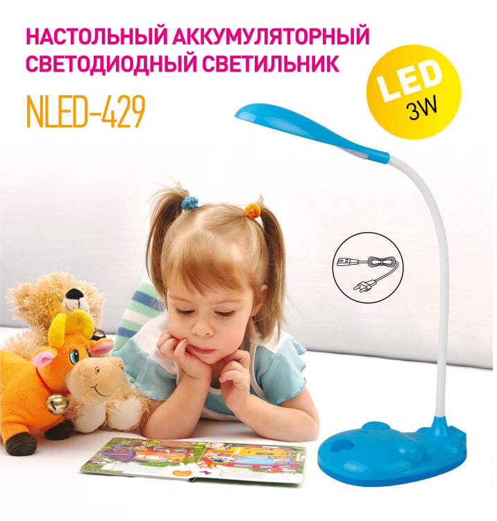 Настольный аккумуляторный светодиодный светильник ЭРА NLED-429-3W-BU - детская компактная модель с основанием в виде мордочки медвежонка. Светильник может работать автономно - просто зарядите его и используйте там, где он нужен. Не важно, есть ли поблизости розетка. Можно выбрать максимальную яркость или приглушенный свет. У светильника съемный сетевой шнур в комплекте, его легко перевозить и хранить. Часто этот светильник используют в качестве бытового фонарика.
