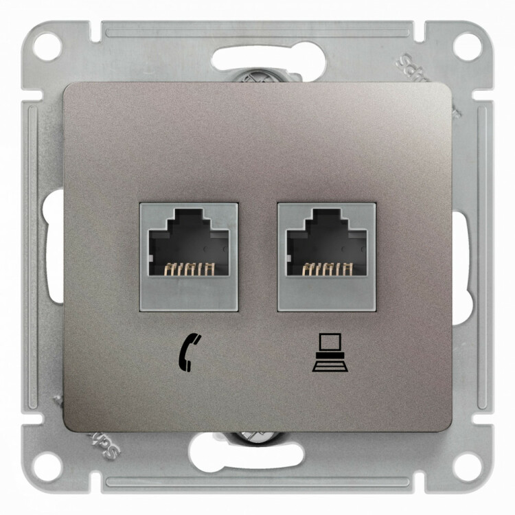 Механизм Systeme Electric (ранее Schneider Electric) серии Glossa (цвет платина) двойной розетки разъёмами RJ45 категория 5е и RJ11 предназначен для удобного и быстрого подключения вашего компьютера и телефона к соответствующим сетям. Выполнен из материала PС+ASA, стойкого к УФ-излучению и появлению царапин.