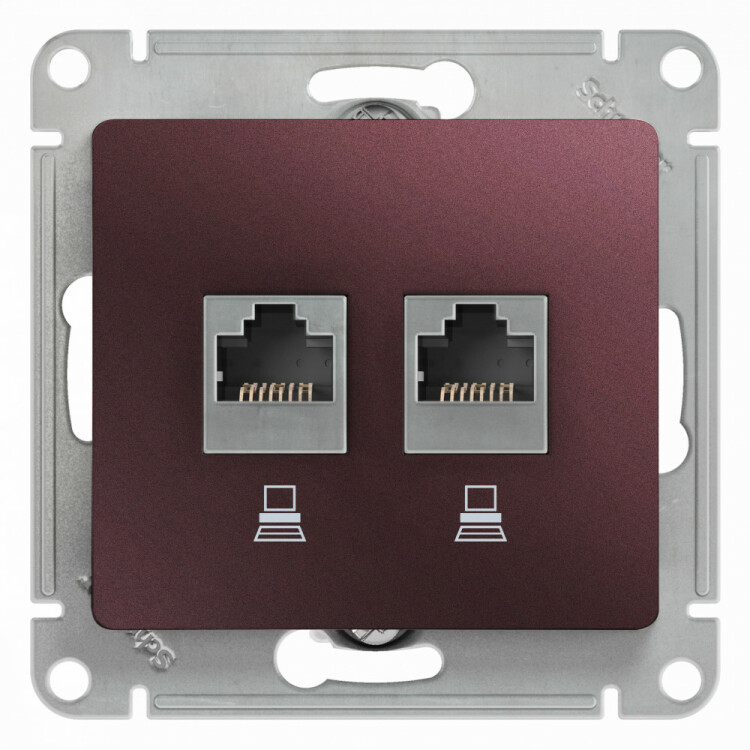 Механизм Systeme Electric (ранее Schneider Electric) серии Glossa (цвет баклажановый) двойной розетки компьютерной с разъёмом RJ45 категория 5е предназначен для удобного и быстрого подключения вашего компьютера к компьютерной сети. Выполнен из материала PС+ASA, стойкого к УФ-излучению и появлению царапин.