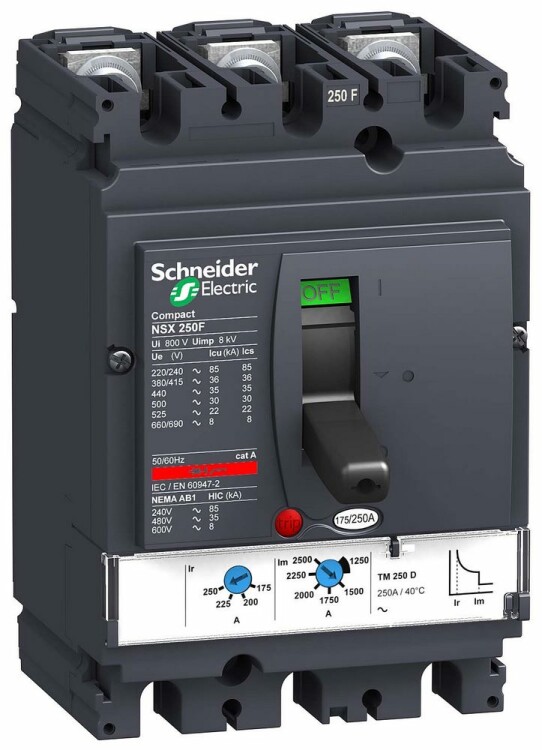 Автоматический выключатель Compact NSX250N Schneider Electric, исполнение - 3P3d - номинальный ток 250 А - Icu = 50 kA 380/415 В - Ics = 100% Icu - с термомагнитным расцепителем TM-D - ШхВхГ - 105x161x86 мм - исполнение - стационарный - монтаж - на плате. Преимущества: Прямой доступ к экономии затрат, безопасность и защита, контроль и измерение параметров электроэнергии, надежность энергоснабжения, простота и удобство. Применения: Применение в системах электроснабжения объектов любого масштаба – от крупнейших промышленных предприятий до офисных зданий для защиты распределительных сетей, генераторов, кабелей большой протяженности, электродвигателей.