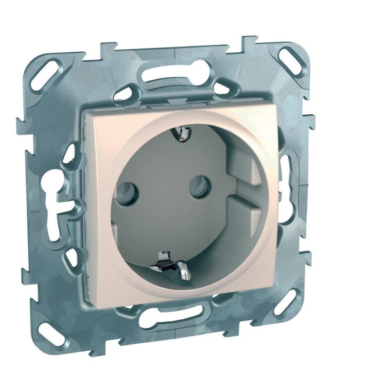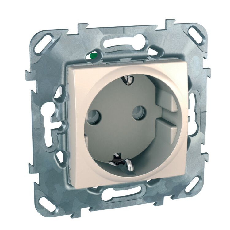 Розетка Schneider Electric UNICA (бежевый) с заземлением, со шторками, с быстрозажимными клеммами предназначена для сетей до 250 В на ток до 16 А.