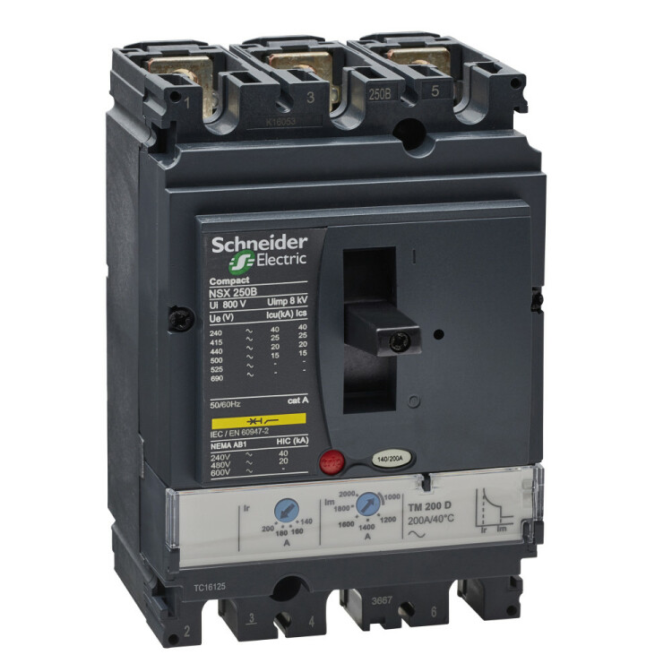 Автоматический выключатель Compact NSX250B Schneider Electric, исполнение - 3P3d - номинальный ток 200 А - Icu = 25 kA 380/415 В - Ics = 100% Icu - с термомагнитным расцепителем TM-D - ШхВхГ - 105x161x86 мм - исполнение - стационарный - монтаж - на плате. Преимущества: Прямой доступ к экономии затрат, безопасность и защита, контроль и измерение параметров электроэнергии, надежность энергоснабжения, простота и удобство. Применения: Применение в системах электроснабжения объектов любого масштаба – от крупнейших промышленных предприятий до офисных зданий для защиты распределительных сетей, генераторов, кабелей большой протяженности, электродвигателей.