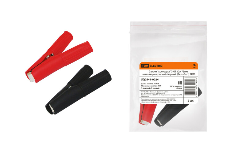 Зажим "крокодил" ЗКИ 30А 75мм в изоляции красный/черный (1шт+1шт) TDM (кр.10упак)