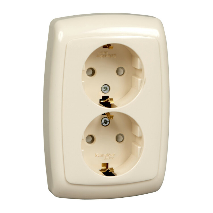 Розетка Schneider Electric РОНДО (скрытой установки, цвет слоновая кость) двойная с заземлением и со шторками предназначена для сетей до 250 В на ток до 16 А.