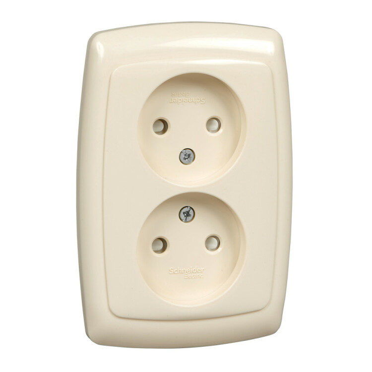 Розетка Schneider Electric РОНДО (скрытой установки, цвет слоновая кость) двойная без заземления и со шторками предназначена для сетей до 250 В на ток до 16 А.