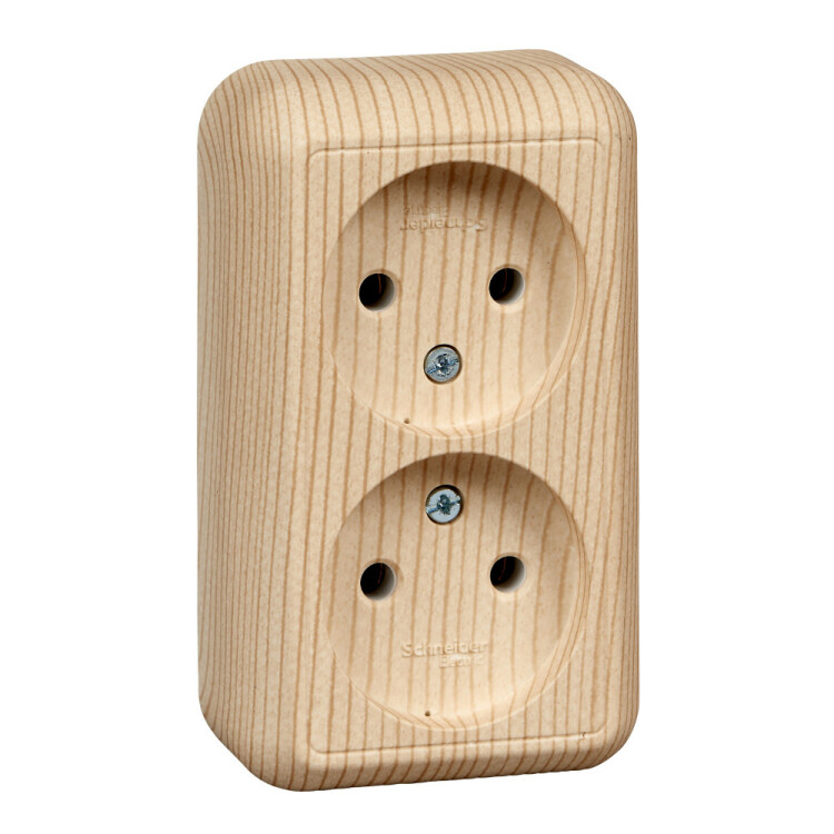 Розетка двойная Schneider Electric ПРИМА (открытая установка, сосна) без заземления и без шторок, с изолирующей пластиковой пластиной предназначена для сетей до 250 В на ток до 16 А.