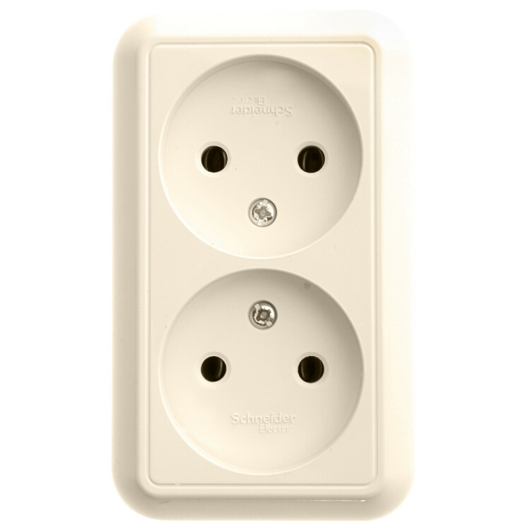 Розетка двойная Schneider Electric ПРИМА (открытой установки, цвет слоновая кость) без заземления и без шторок, с изолирующей пластиковой пластиной предназначена для сетей до 250 В на ток до 16 А.