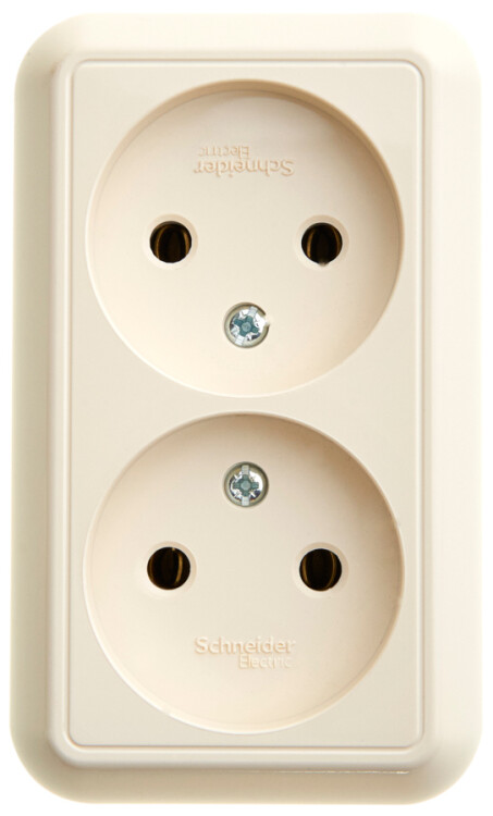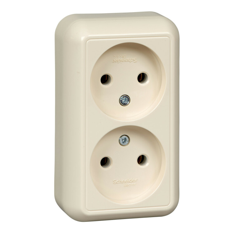 Розетка двойная Schneider Electric ПРИМА (открытой установки, цвет слоновая кость) без заземления и без шторок, с изолирующей пластиковой пластиной предназначена для сетей до 250 В на ток до 16 А.
