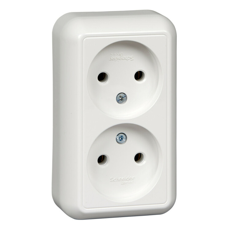 Розетка двойная Schneider Electric ПРИМА (открытой установки, цвет белый) без заземления и без шторок, с монтажной стальной пластиной предназначена для сетей до 250 В на ток до 16 А.