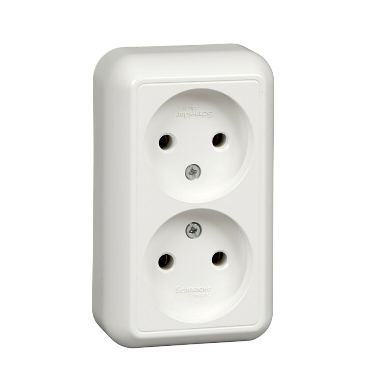 Розетка двойная Schneider Electric ПРИМА (открытой установки, цвет белый) без заземления и без шторок, с монтажной стальной пластиной предназначена для сетей до 250 В на ток до 16 А.