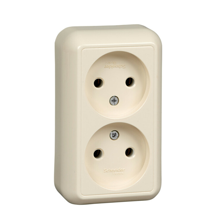 Розетка двойная Schneider Electric ПРИМА (открытой установки, цвет слоновая кость) без заземления и без шторок, с монтажной стальной пластиной предназначена для сетей до 250 В на ток до 16 А.