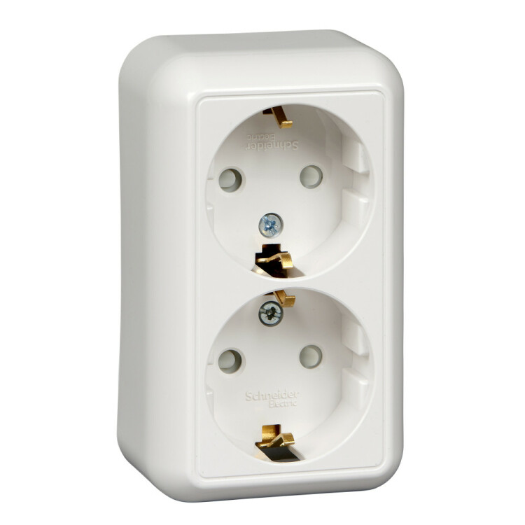 Розетка двойная Schneider Electric ПРИМА (открытой установки, цвет белый) с заземлением и со шторками предназначена для сетей до 250 В на ток до 16 А.