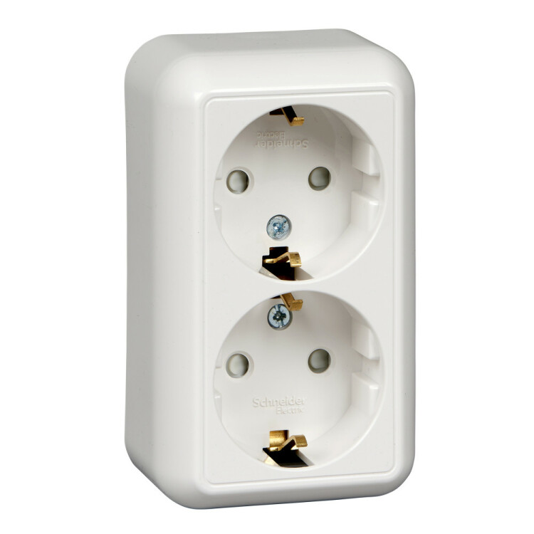 Розетка двойная Schneider Electric ПРИМА (открытой установки, цвет белый) с заземлением и со шторками, с монтажной стальной пластиной предназначена для сетей до 250 В на ток до 16 А.