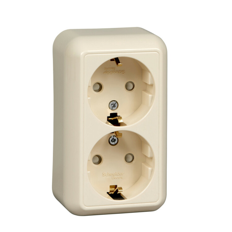 Розетка двойная Schneider Electric ПРИМА (открытой установки, цвет слоновая кость) с заземлением и со шторками, с монтажной стальной пластиной предназначена для сетей до 250 В на ток до 16 А.