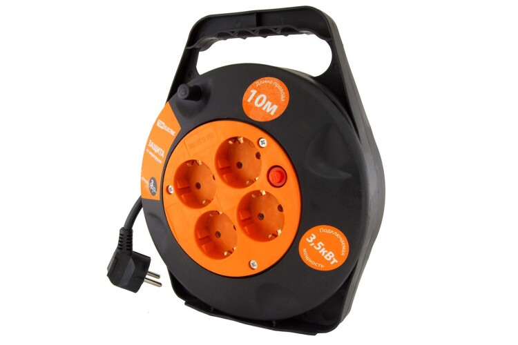 Применение:На стройке;На садовом участке;В промышленностиВ быту Материалы:Катушка из ударопрочного пластика или металла толщиной 0,8-0,9 мм;Стальная стойка, окрашенная с помощью порошковой технологии.Преимущества:Конструкция крепления барабана обеспечивает легкость намотки провода любого сечения;Высокая износостойкость и долговечность благодаря ударопрочному пластику;Удлинители с обрезиненным штепсельным гнездом позволяют подключать электроприборы, которые требует мобильного перемещения (электрогазонокосилки и т.д.)Мягкая изолирующая ручка облегчит транспортировку изделия и защитит от поражения электрическим током при повреждении изоляции. Назначение:Для подключения удаленных на расстояние до 50 м от стационарной розетки электроприборов. 0: