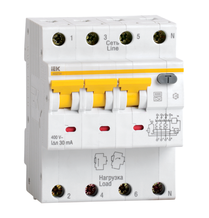 АВДТ34 выпускаются в четырехполюсном исполнении на номинальные токи 6, 10, 16, 20, 25, 32, 40, 50, 63 А и номинальные отключающие дифференциальные токи 10, 30, 100, 300 мА.